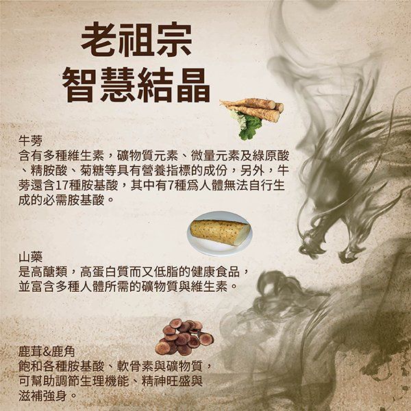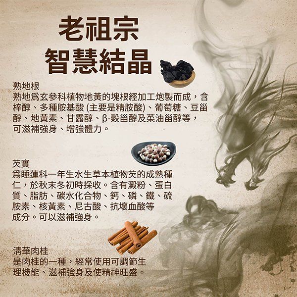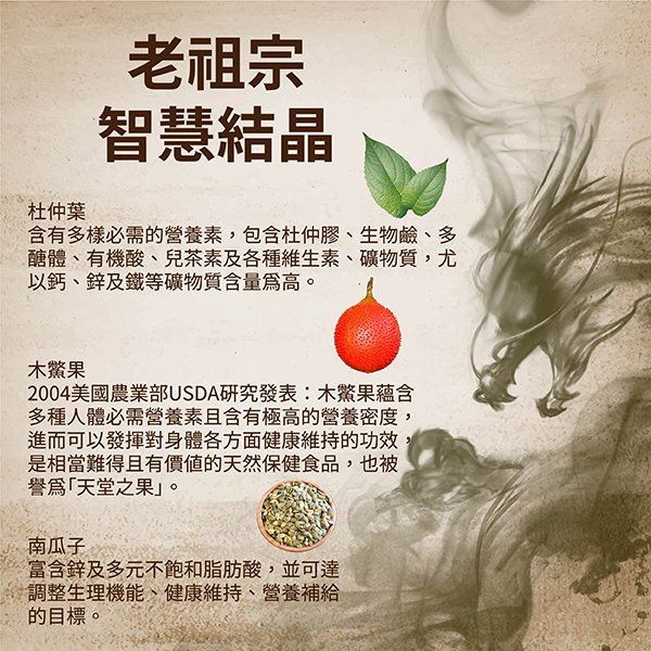 成 分:杜仲葉萃取物、南瓜子萃取物、木鱉果萃取物、熟地根萃取物、芡實萃取物、清華肉桂、牛蒡萃取物、鹿角萃取物、鹿茸萃取物、山藥萃取物。