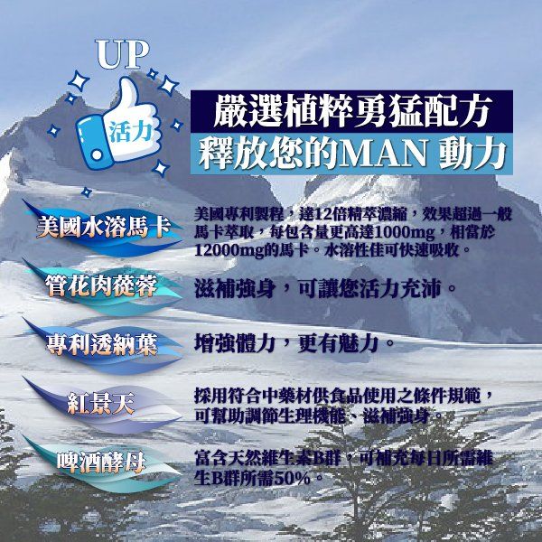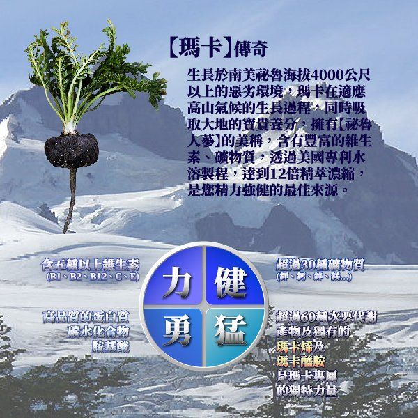成 分:馬卡萃取物(馬卡萃取物、麥芽糊精)、薑母茶粉(砂糖、黑糖、麥芽糊精、薑母原汁、關華豆膠、阿拉伯膠、香料、水性辣椒精)、牛磺酸、酵母(含維生素B1、維生素B2、維生素B6、維生素B12、菸鹼酸、葉酸、生物素、泛酸)透納葉萃取物(透納葉萃取物、阿拉伯膠、二氧化矽)管花肉蓯蓉萃取物(管花肉蓯蓉萃取、麥芽糊精)、紅景天萃取物。